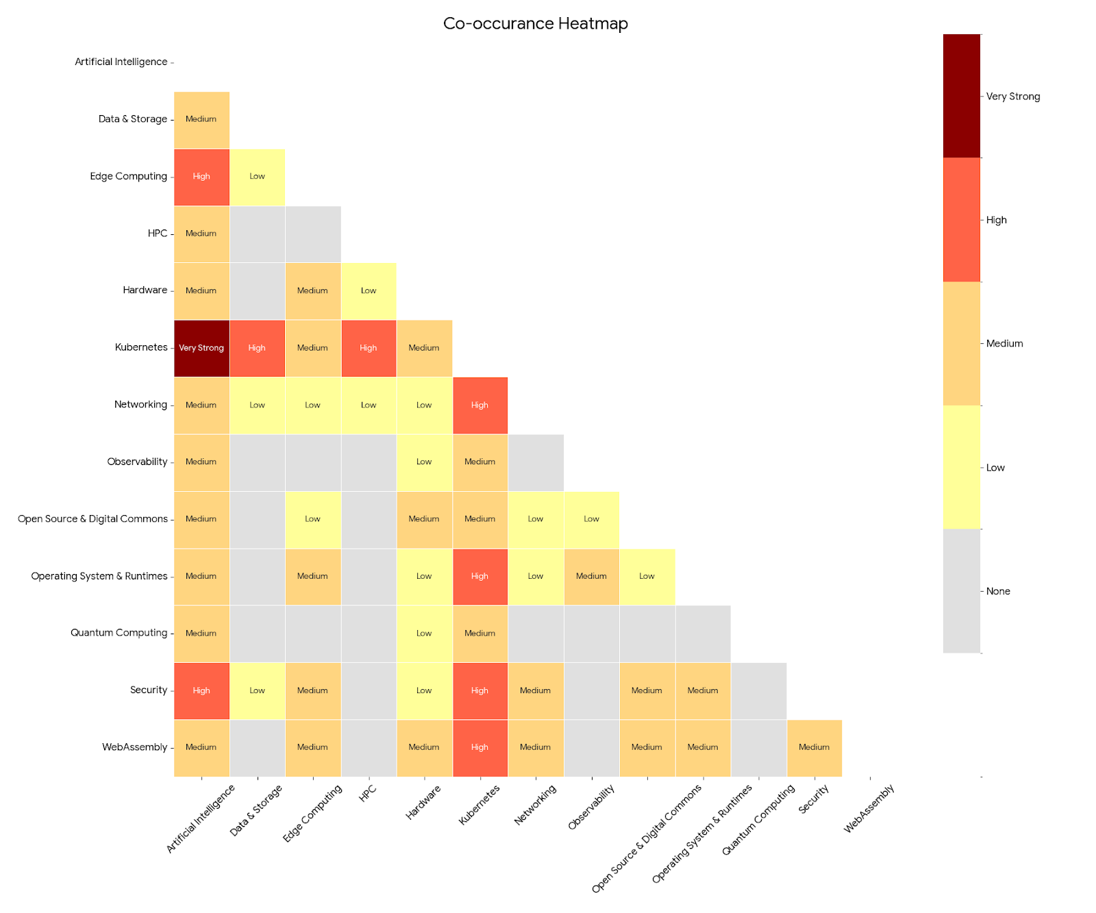 Kubernetes and the ecosystem around it are still the main motivators for most submissions. This is to be expected at the conference. AI follows closely as the next major category, with talks focusing on MCP, Agent Networks, GPU, and LLM hosting. The other areas are kinda stable. The heatmap below shows where each